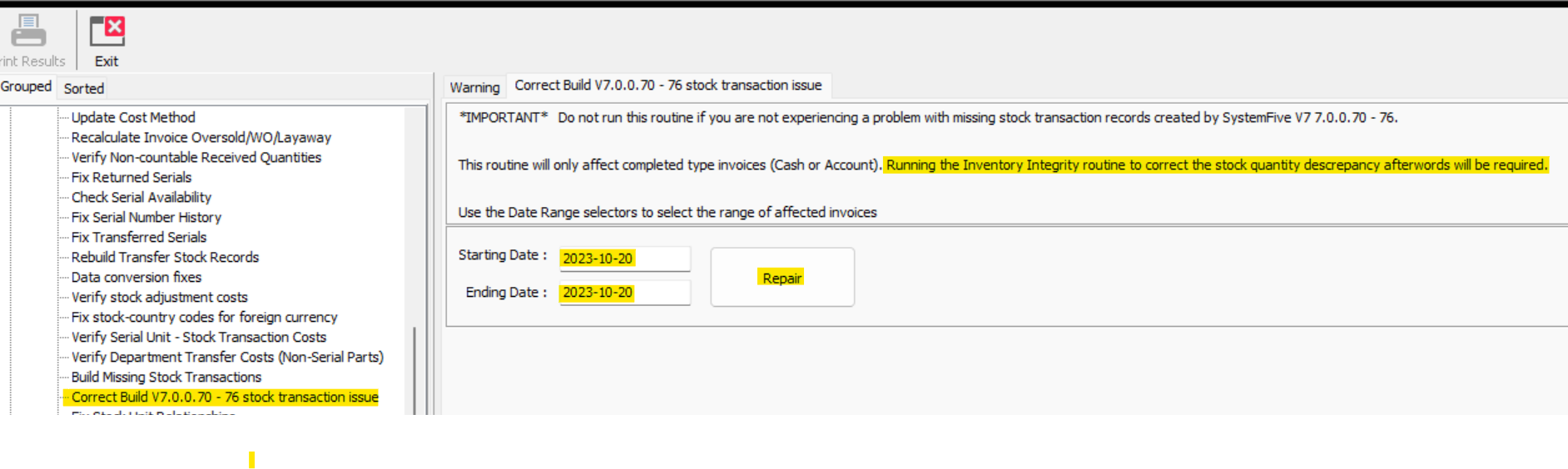 - Open "toolbox routine" -> "inventory routines" -> "stock control routines" -> "Correct V7 7.0.0.70 -76 stock control issues"